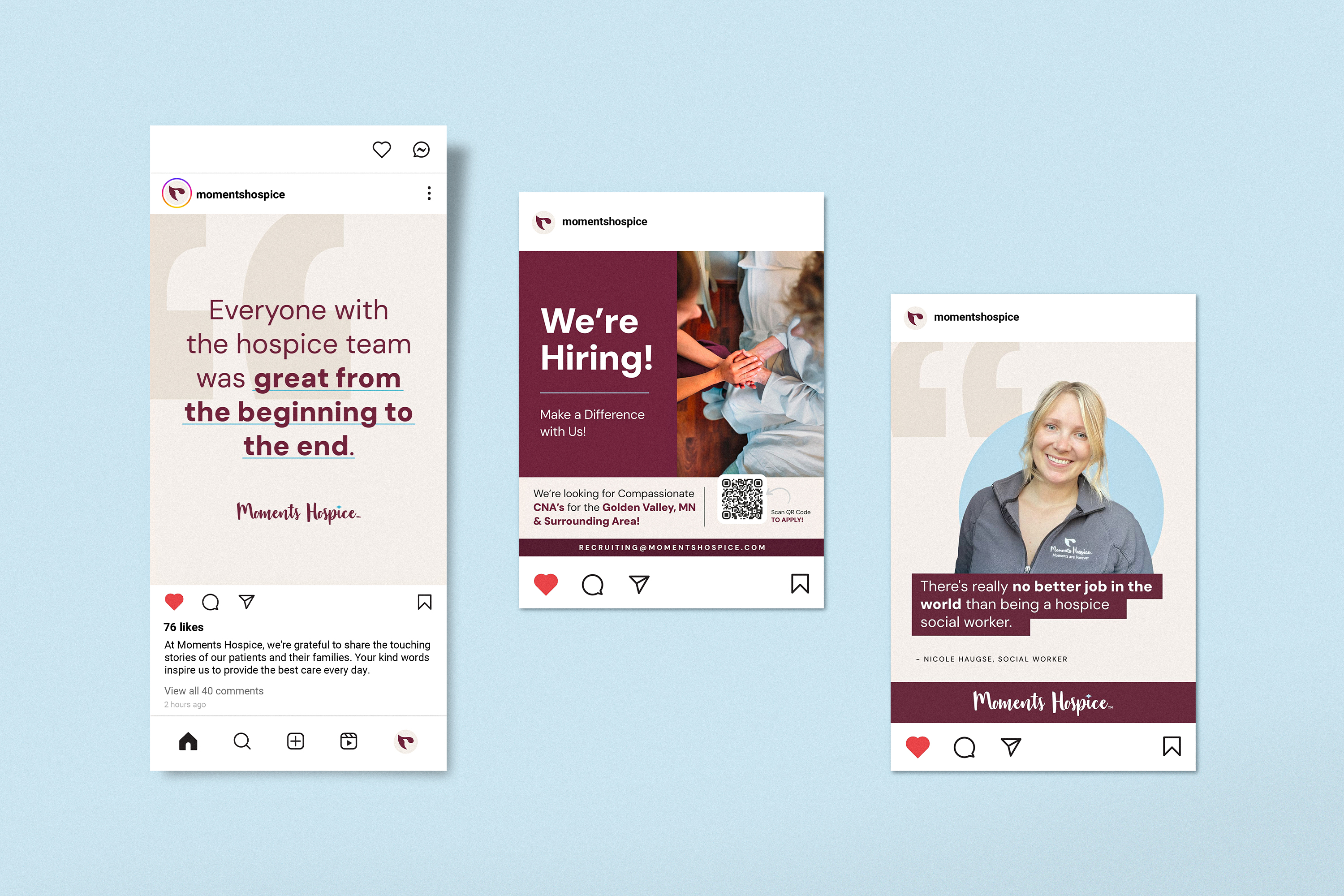 For Moments Hospice, I led a full rebrand focused on honoring the deeply human side of end-of-life care. The goal was to create a visual identity that felt comforting, trustworthy, and compassionate—while staying modern and approachable.